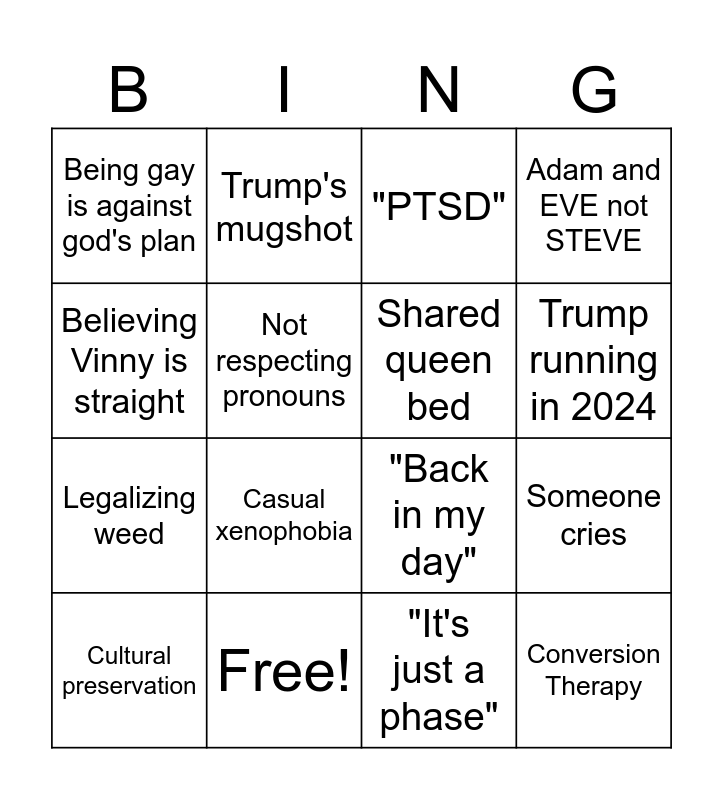 This bingo card has 21 words: Free!, Calls Lauren a "friend", Trump's mugshot, Gay isn't "natural", "It's just a phase", Shared queen bed, Being gay is against god's plan, "PTSD", "Back in my day", Trump running in 2024, Legalizing weed, Adam and EVE not STEVE, Conversion Therapy, Traditional family roles, Not respecting pronouns, Casual racism, Cultural preservation, Casual xenophobia, Believing Vinny is straight, Someone cries and Judging alt people in public.