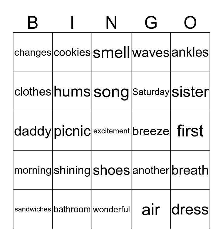 This bingo card has a free space and 24 words: shining, bathroom, song, sandwiches, ankles, changes, clothes, cookies, breeze, shoes, Saturday, daddy, another, breath, hums, air, first, smell, sister, picnic, dress, morning, waves and wonderful.