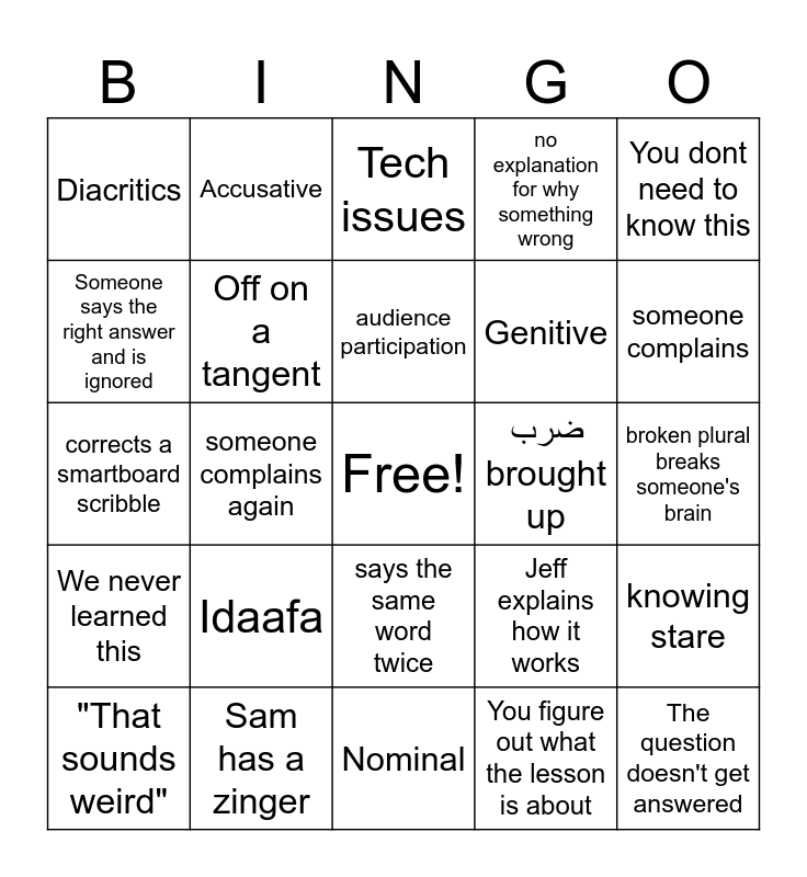 This bingo card has a free space and 24 words: Idaafa, Sam has a zinger, audience participation, "That sounds weird", You dont need to know this, Diacritics, Someone says the right answer and is ignored, Accusative, ضرب brought up, says the same word twice, Genitive, corrects a smartboard scribble, Jeff explains how it works, knowing stare, Off on a tangent, You figure out what the lesson is about, broken plural breaks someone's brain, Tech issues, someone complains, someone complains again, The question doesn't get answered, We never learned this, no explanation for why something wrong and Nominal.