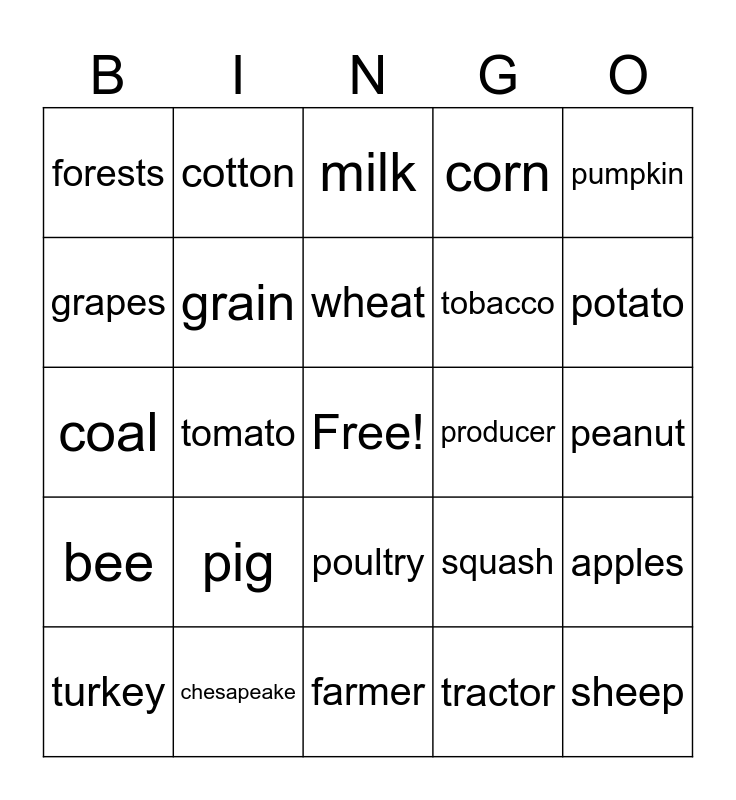 This bingo card has a free space and 24 words: pig, chesapeake, wheat, turkey, pumpkin, forests, grapes, cotton, producer, poultry, tobacco, coal, squash, apples, grain, tractor, peanut, milk, potato, tomato, sheep, bee, corn and farmer.