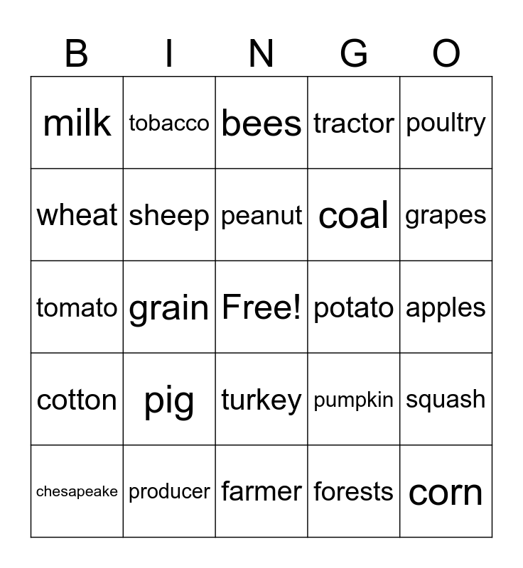 This bingo card has a free space and 24 words: pig, producer, peanut, chesapeake, poultry, milk, wheat, tobacco, potato, turkey, coal, tomato, pumpkin, squash, sheep, forests, apples, bees, grapes, grain, corn, cotton, tractor and farmer.