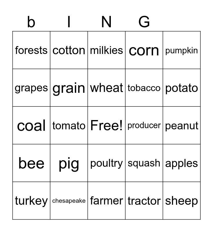 This bingo card has a free space and 24 words: pig, chesapeake, wheat, turkey, pumpkin, forests, grapes, cotton, producer, poultry, tobacco, coal, squash, apples, grain, tractor, peanut, milkies, potato, tomato, sheep, bee, corn and farmer.