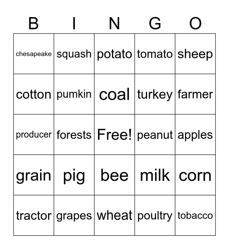 This bingo card has a free space and 24 words: pig, grapes, coal, tractor, sheep, chesapeake, cotton, squash, peanut, bee, turkey, producer, milk, corn, pumkin, poultry, apples, potato, farmer, forests, tobacco, grain, tomato and wheat.