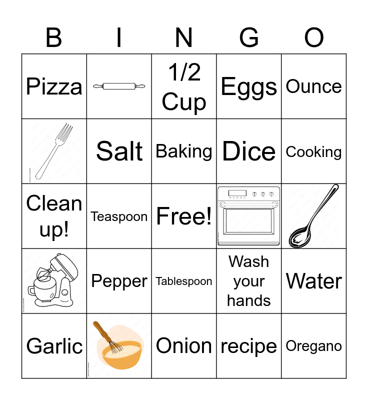 This bingo card has 6 images, a free space and 18 words: Pepper, Baking, Garlic, Ounce, Pizza, Tablespoon, Dice, Clean up!, Wash your hands, Water, Salt, recipe, 1/2 Cup, Cooking, Teaspoon, Oregano, Eggs and Onion.
