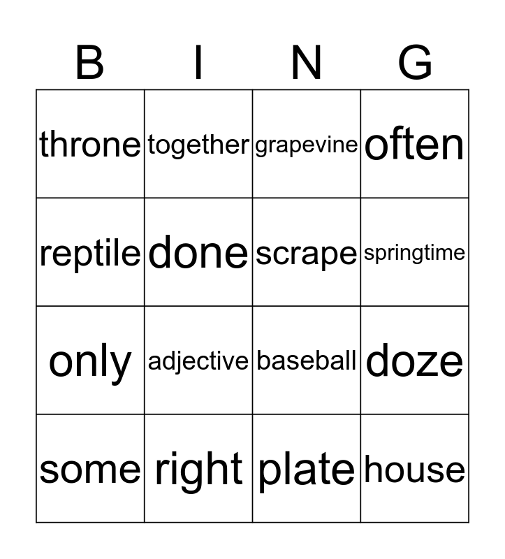 This bingo card has 21 words: right, place, together, slope, plate, scrape, throne, grapevine, baseball, springtime, only, often, house, place, done, come, some, adjective, reptile, doze and rise.