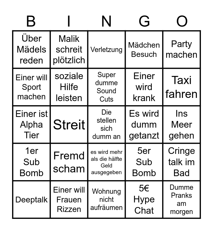 This bingo card has 25 words: Fremd scham, Wohnung nicht aufräumen, Super dumme Sound Cuts, Deeptalk, Party machen, Über Mädels reden, Einer will Sport machen, Malik schreit plötzlich, Es wird dumm getanzt, es wird mehr als die hälfte Geld ausgegeben, Einer wird krank, Einer ist Alpha Tier, 5er Sub Bomb, Cringe talk im Bad, soziale Hilfe leisten, Dumme Pranks am morgen, Ins Meer gehen, Verletzung, Taxi fahren, Streit, Die stellen sich dumm an, Einer will Frauen Rizzen, 1er Sub Bomb, Mädchen Besuch and 5€ Hype Chat.