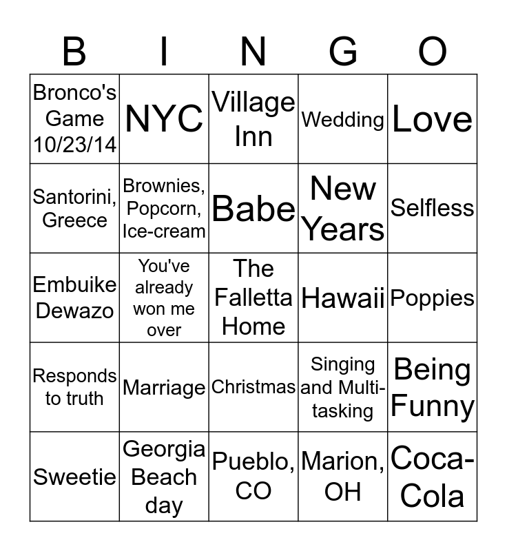 This bingo card has 25 words: Marriage, Pueblo, CO, Babe, Sweetie, Love, Bronco's Game 10/23/14, Santorini, Greece, NYC, Hawaii, Christmas, New Years, Embuike Dewazo, Singing and Multi-tasking, Being Funny, Brownies, Popcorn, Ice-cream, Coca-Cola, Poppies, Village Inn, Selfless, You've already won me over, The Falletta Home, Georgia Beach day, Responds to truth, Wedding and Marion, OH.