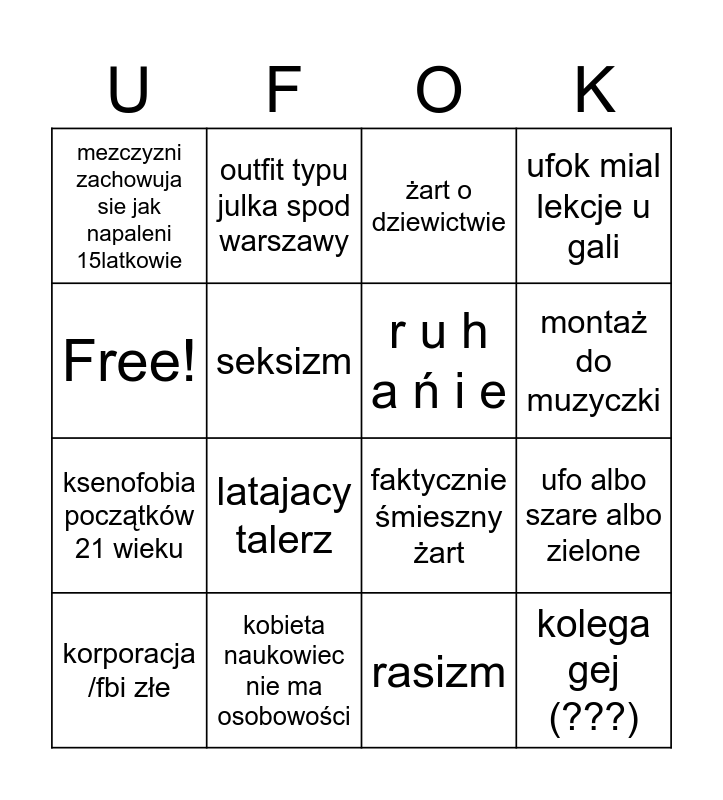 This bingo card has 16 words: kobieta naukowiec nie ma osobowości, ufo albo szare albo zielone, żart o dziewictwie, mezczyzni zachowuja sie jak napaleni 15latkowie, ksenofobia początków 21 wieku, outfit typu julka spod warszawy, faktycznie śmieszny żart, rasizm, Free!, seksizm, korporacja /fbi złe, ufok mial lekcje u gali, latajacy talerz, montaż do muzyczki, r u h a ń i e and kolega gej (???).
