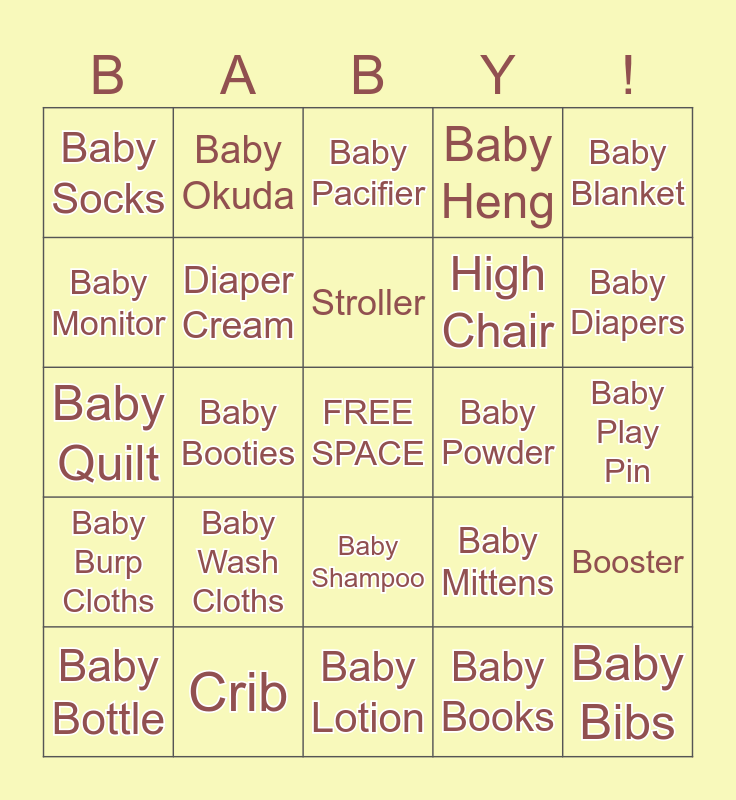 This bingo card has a free space and 29 words: Baby Bottle, Baby Wipes, Baby Booties, Baby Rattle, Baby Socks, Baby Pacifier, Diaper Cream, Baby Wash Cloths, Baby Powder, Crib, Baby Play Pin, Baby Bibs, Baby Lotion, Baby Books, Baby Diapers, Diaper Bag, Baby Shampoo, Baby Burp Cloths, Baby Blanket, Baby Quilt, Baby Mittens, Baby Hats, High Chair, Baby Monitor, Baby Heng, Baby Okuda, Booster, Stroller and Crib Mobile.
