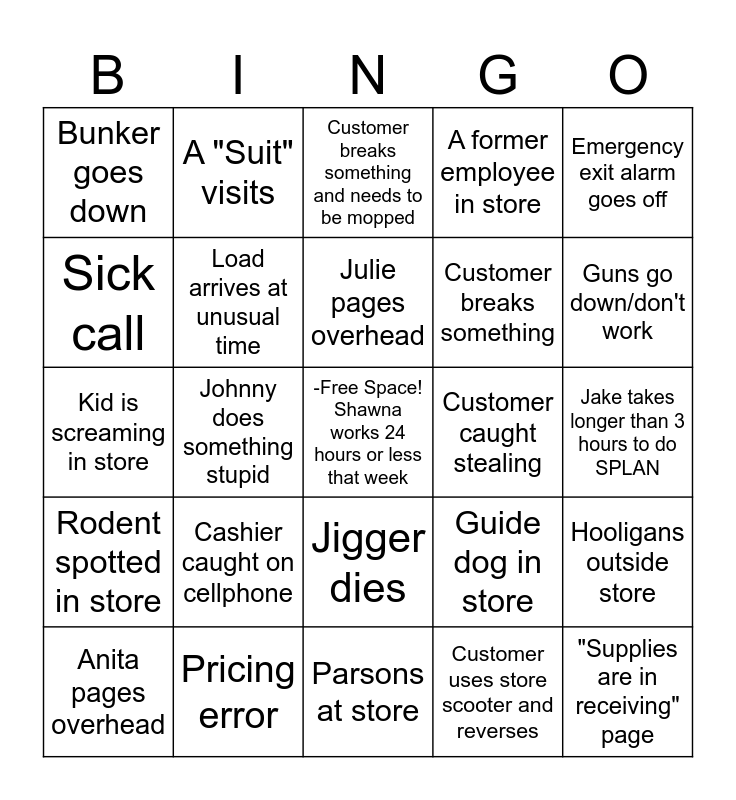 This bingo card has a free space and 24 words: Cashier caught on cellphone, Pricing error, Julie pages overhead, Anita pages overhead, Emergency exit alarm goes off, Bunker goes down, Sick call, A "Suit" visits, Customer caught stealing, Jigger dies, Customer breaks something, Kid is screaming in store, Guide dog in store, Hooligans outside store, Load arrives at unusual time, Customer uses store scooter and reverses, Jake takes longer than 3 hours to do SPLAN, Customer breaks something and needs to be mopped, Guns go down/don't work, Johnny does something stupid, "Supplies are in receiving" page, Rodent spotted in store, A former employee in store and Parsons at store.