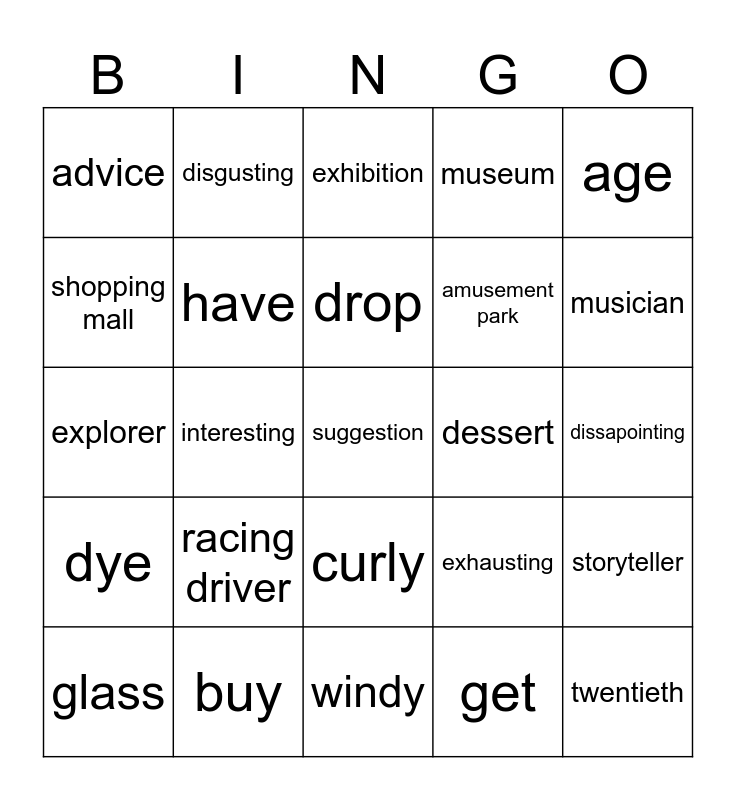 This bingo card has 60 words: borrow, buy, drive, dye, get, go, have, stay out, amusement park, library, museum, park, shopping mall, skating rink, swimming pool, advice, suggestion, age, ankle, drop, dessert, exhibition, glass, storyteller, architect, artist, fashion designer, inventor, musician, politician, scientist, writer, awesome, awful, disgusting, delicious, fantastic, interesting, successful, explorer, composer, racing driver, dissapointing, exciting, exhausting, scary, worse, better, baggy, curly, windy, young, thirtieth, twelfth, first, second, third, eleventh, twentieth and seventeenth.