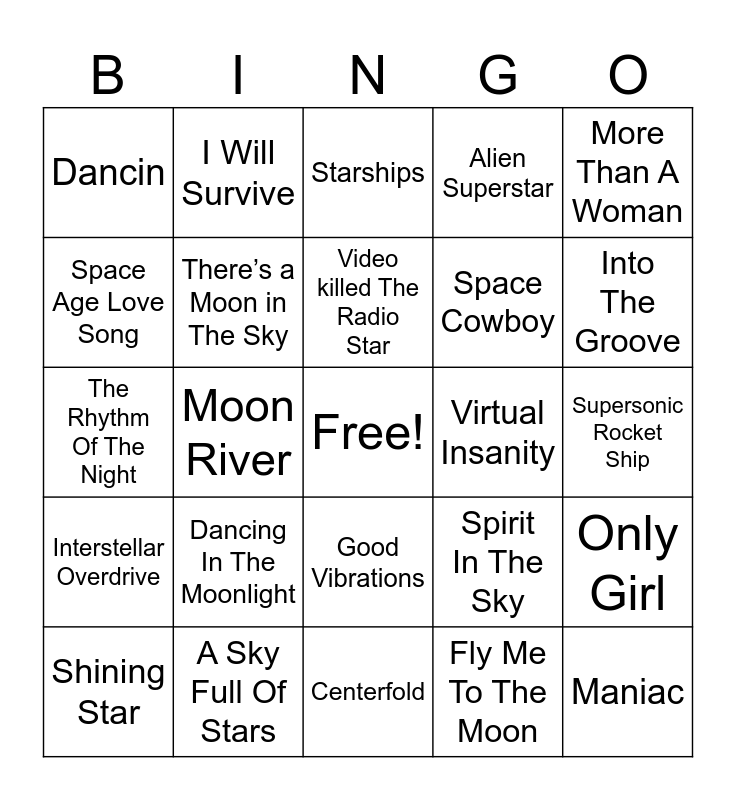 This bingo card has a free space and 59 words: Space Jam, A Sky Full Of Stars, Rocket Man, Interstellar Overdrive, Fly Me To The Moon, Intergalactic, There’s a Moon in The Sky, Around the World, Space Cowboy, Get Ready, Alien Superstar, Starboy, Space Age Love Song, Talking To The Moon, One More Time, Dancin, Maniac, More Than A Woman, E.T., Video killed The Radio Star, Virtual Insanity, Starships, Shining Star, Only Girl, Radioactive, Never Gonna Give You Up, You Spin Me Round, Everybody Wants To Rule The World, Into The Groove, Boogie Wonderland, Thriller, Venus, Drops Of Jupiter, Good Old Days, I Will Survive, Jump, I Get Around, Moon River, Planet Rock, The Rhythm Of The Night, Soak Up The Sun, Dancing In The Moonlight, Supersonic Rocket Ship, Bad Moon Rising, Hey Pocky Way, Let It Whip, I'll Take You There, Superstition, Good Vibrations, Centerfold, I’m Gonna Be, The Imperial March, Moonage Daydream, Pump It Up, Dance The Night Away, Spirit In The Sky, Me and Julio Down By the Schoolyard, Jungle Boogie and A Fifth of Beethoven.
