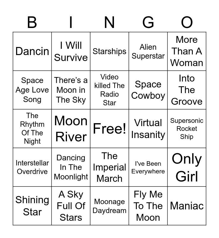 This bingo card has a free space and 59 words: Space Jam, A Sky Full Of Stars, Rocket Man, Interstellar Overdrive, Fly Me To The Moon, Intergalactic, There’s a Moon in The Sky, Around the World, Space Cowboy, Get Ready, Alien Superstar, Starboy, Space Age Love Song, Talking To The Moon, One More Time, Dancin, Maniac, More Than A Woman, E.T., Video killed The Radio Star, Virtual Insanity, Starships, Shining Star, Only Girl, Radioactive, Never Gonna Give You Up, You Spin Me Round, Everybody Wants To Rule The World, Into The Groove, Boogie Wonderland, Thriller, Venus, Drops Of Jupiter, Good Old Days, I Will Survive, Jump, I Get Around, Moon River, Planet Rock, The Rhythm Of The Night, Soak Up The Sun, Dancing In The Moonlight, Supersonic Rocket Ship, Bad Moon Rising, Hey Pocky Way, Let It Whip, Centerfold, I’m Gonna Be, The Imperial March, Moonage Daydream, Pump It Up, Dance The Night Away, Spirit In The Sky, Me and Julio Down By the Schoolyard, Jungle Boogie, I've Been Everywhere, Get Down Tonight, StarStruck and A Fifth of Beethoven.