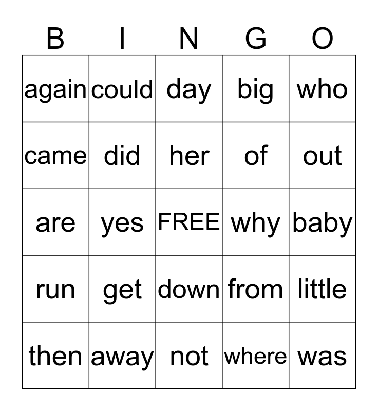 This bingo card has a free space and 24 words: get, away, her, then, who, again, came, could, why, down, of, are, from, little, did, where, baby, day, out, yes, was, run, big and not.