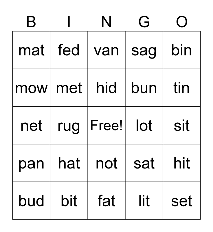 This bingo card has a free space and 29 words: bud, ban, rug, dog, mat, van, met, hat, lot, bit, sit, set, fat, lit, tin, dot, not, pan, bin, net, sat, let, bun, mow, sag, fed, hit, hid and man.