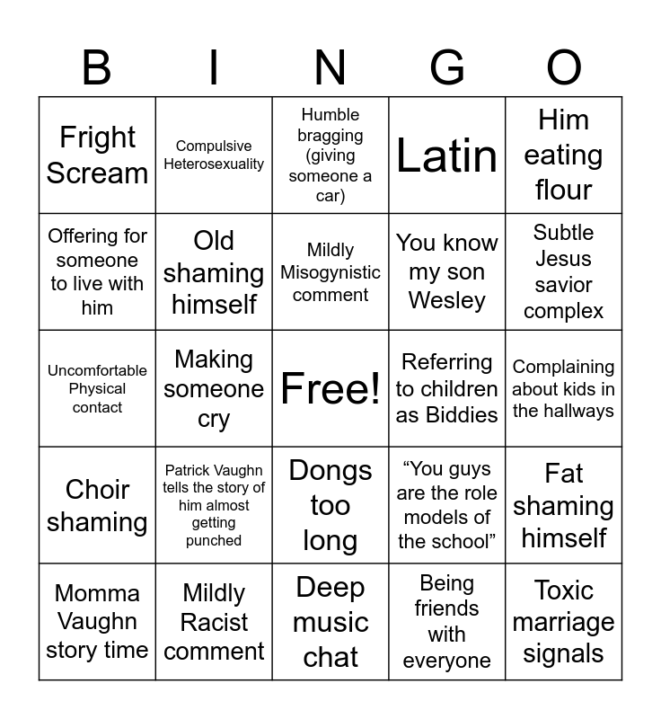 This bingo card has a free space and 24 words: Patrick Vaughn tells the story of him almost getting punched, Mildly Racist comment, Mildly Misogynistic comment, Momma Vaughn story time, Him eating flour, Fright Scream, Offering for someone to live with him, Compulsive Heterosexuality, Referring to children as Biddies, Dongs too long, You know my son Wesley, Uncomfortable Physical contact, “You guys are the role models of the school”, Fat shaming himself, Old shaming himself, Being friends with everyone, Complaining about kids in the hallways, Humble bragging (giving someone a car), Subtle Jesus savior complex, Making someone cry, Toxic marriage signals, Choir shaming, Latin and Deep music chat.