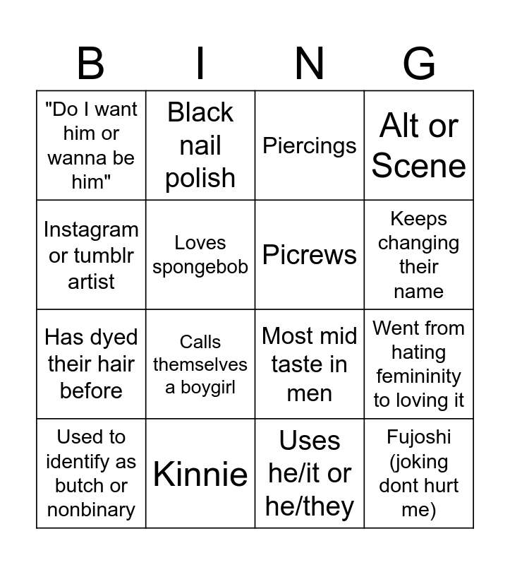 This bingo card has 16 words: Kinnie, Went from hating femininity to loving it, Piercings, "Do I want him or wanna be him", Has dyed their hair before, Black nail polish, Most mid taste in men, Uses he/it or he/they, Instagram or tumblr artist, Loves spongebob, Used to identify as butch or nonbinary, Alt or Scene, Calls themselves a boygirl, Keeps changing their name, Picrews and Fujoshi (joking dont hurt me).