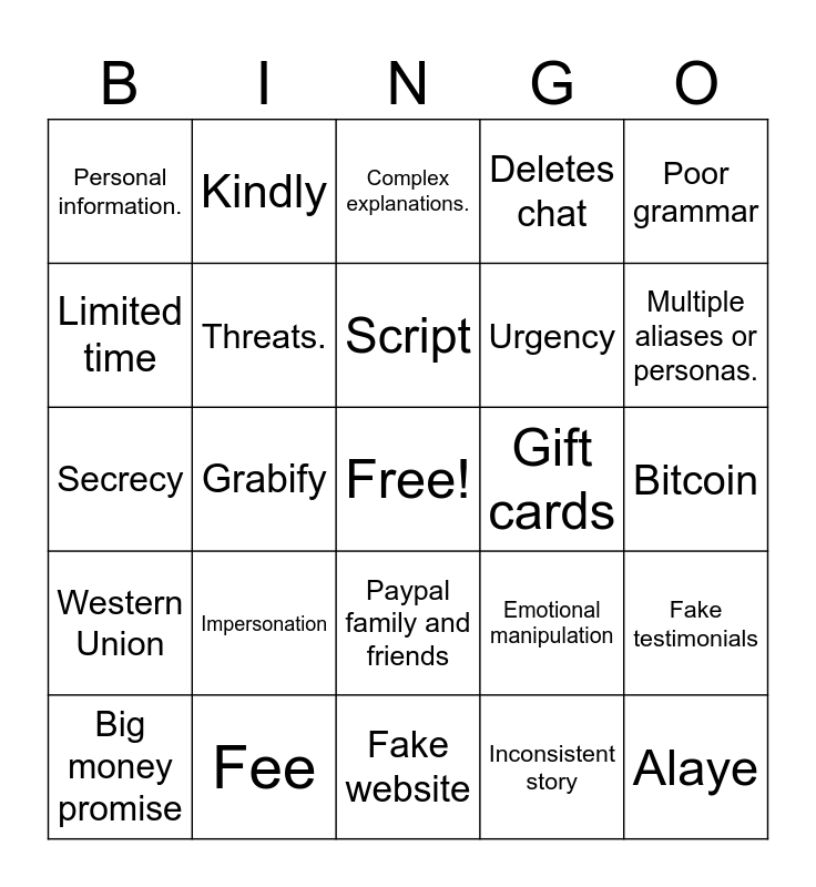 This bingo card has a free space and 24 words: Impersonation, Fee, Script, Big money promise, Poor grammar, Personal information., Limited time, Kindly, Gift cards, Paypal family and friends, Urgency, Secrecy, Emotional manipulation, Fake testimonials, Threats., Inconsistent story, Bitcoin, Complex explanations., Multiple aliases or personas., Grabify, Alaye, Western Union, Deletes chat and Fake website.