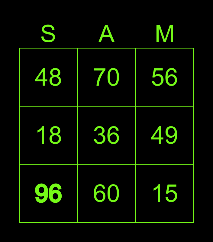 This bingo card has 9 words: 96, 36, 56, 48, 70, 49, 18, 60 and 15.