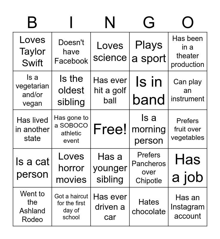 This bingo card has a free space and 24 words: Loves horror movies, Got a haircut for the first day of school, Has ever hit a golf ball, Went to the Ashland Rodeo, Has been in a theater production, Loves Taylor Swift, Is a vegetarian and/or vegan, Doesn't have Facebook, Is a morning person, Has a younger sibling, Is in band, Has lived in another state, Prefers Pancheros over Chipotle, Has a job, Is the oldest sibling, Hates chocolate, Prefers fruit over vegetables, Loves science, Can play an instrument, Has gone to a SOBOCO athletic event, Has an Instagram account, Is a cat person, Plays a sport and Has ever driven a car.