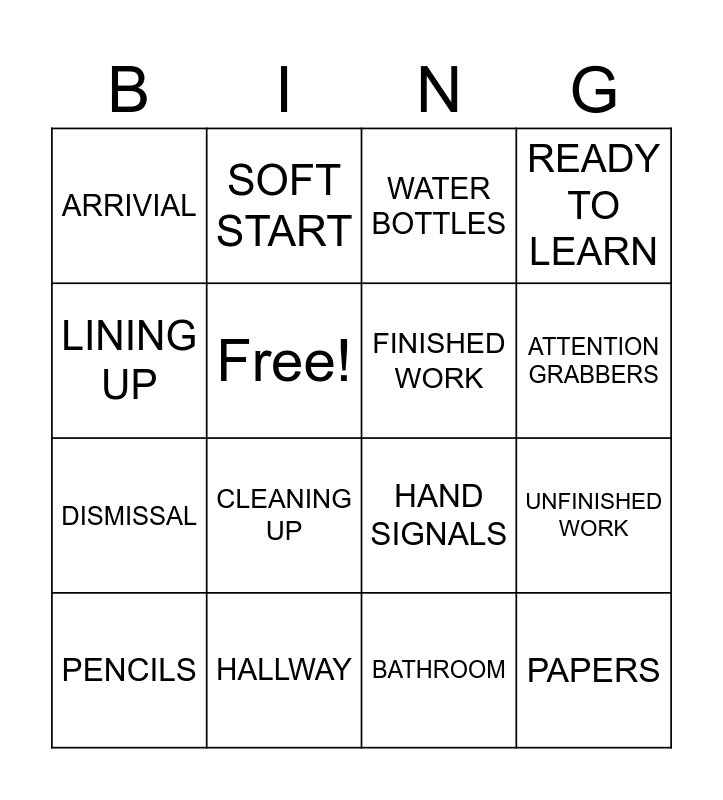 This bingo card has 16 words: HALLWAY, UNFINISHED WORK, WATER BOTTLES, ARRIVIAL, DISMISSAL, SOFT START, HAND SIGNALS, BATHROOM, LINING UP, Free!, PENCILS, READY TO LEARN, CLEANING UP, ATTENTION GRABBERS, FINISHED WORK and PAPERS.