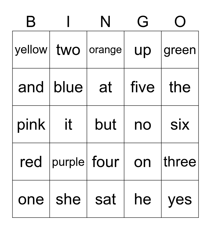 This bingo card has a free space and 24 words: purple, she, at, one, green, yellow, and, two, no, four, five, pink, on, three, blue, he, six, orange, the, it, yes, red, up and sat.