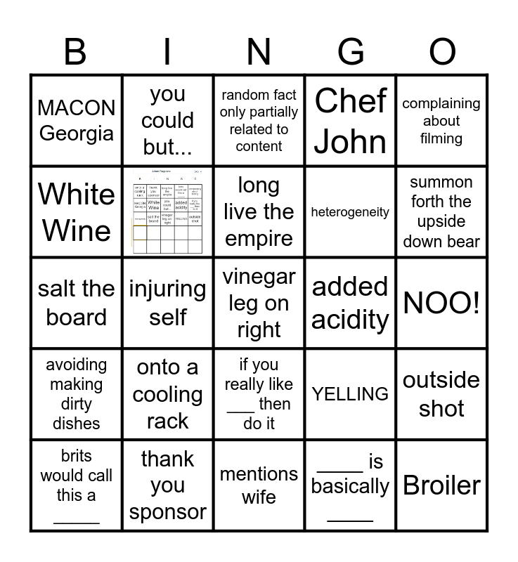 This bingo card has 1 images, a free space and 23 words: onto a cooling rack, thank you sponsor, long live the empire, brits would call this a _____, complaining about filming, MACON Georgia, White Wine, you could but..., added acidity, if you really like ___ then do it, heterogeneity, salt the board, YELLING, outside shot, ____ is basically ____, NOO!, random fact only partially related to content, summon forth the upside down bear, injuring self, Broiler, avoiding making dirty dishes, Chef John and mentions wife.