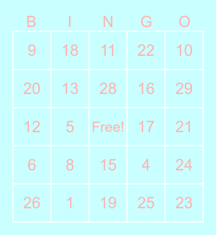 This bingo card has a free space and 30 words: 1, 3, 5, 7, 9, 11, 13, 15, 17, 19, 21, 23, 25, 27, 29, 2, 4, 6, 8, 10, 12, 14, 18, 16, 20, 22, 24, 26, 28 and 30.
