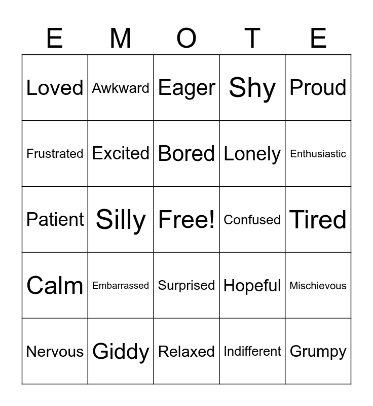 This bingo card has a free space and 39 words: Happy, Sad, Angry, Excited, Nervous, Surprised, Bored, Scared, Proud, Calm, Silly, Shy, Grumpy, Tired, Confused, Embarrassed, Curious, Loved, Jealous, Hopeful, Frustrated, Relaxed, Lonely, Enthusiastic, Joyful, Worried, Playful, Grateful, Relieved, Awkward, Caring, Disappointed, Eager, Giddy, Indifferent, Irritated, Mischievous, Patient and Calm.