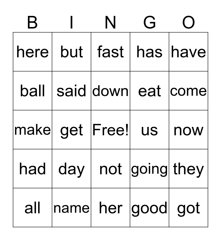 This bingo card has a free space and 24 words: day, name, down, all, have, here, ball, but, us, not, eat, make, going, they, said, good, now, fast, come, get, got, had, has and her.