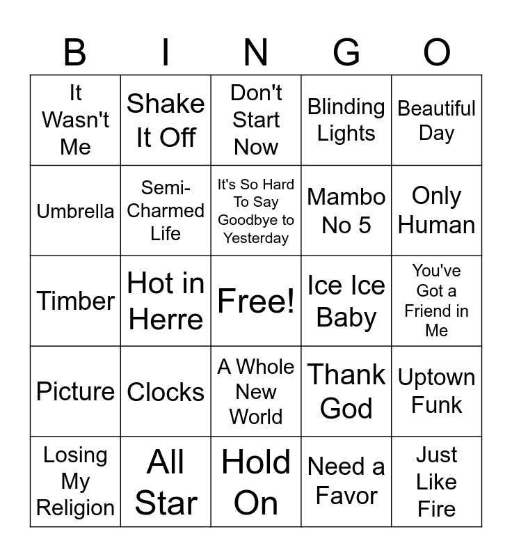 This bingo card has a free space and 69 words: Gettin' Jiggy Wit It, You've Got a Friend in Me, Good For You, Hit Me Baby One More Time, All Star, Hakuna Matata, Blinding Lights, Vogue, Beautiful Day, Who Let the Dogs Out, Uptown Funk, In the End, It Wasn't Me, Don't Start Now, The Sign, Hot in Herre, A Whole New World, Mambo No 5, Rain on Me, Picture, Ice Ice Baby, Thank God, Only Human, I'm Like a Bird, Señorita, Let It Go, Watermelon Sugar, Love Story, Need a Favor, This Is How We Do It, Shake It Off, Shivers, Easy On Me, Fancy Like, Shallow, Bye Bye Bye, Dark Horse, Lose Yourself, Umbrella, Hips Don't Lie, Clocks, Just Like Fire, Say My Name, No Scrubs, I Want It That Way, Losing My Religion, Candle In The Wind, It's My Life, Wannabe, Semi-Charmed Life, It's So Hard To Say Goodbye to Yesterday, Black or White, Livin' La Vida Loca, Hold On, Genie in a Bottle, I Gotta Feeling, Gangnam Style, Ho Hey, Happy, Timber, Royals, Cheerleader, All About That Bass, That's What I Like, Shape of You, Thunder, Old Town Road, God's Plan and Circles.