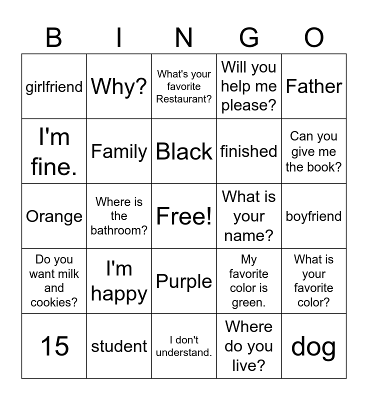 This bingo card has a free space and 29 words: 15, Nice to Meet You!, Where is the bathroom?, blue, girlfriend, What's your favorite Restaurant?, Family, I'm happy, What is your name?, student, boyfriend, dog, I don't understand., Where do you live?, Can you give me the book?, How are you?, Purple, Do you want milk and cookies?, Father, Orange, My favorite color is green., What time is it?, finished, I'm fine., Will you help me please?, Why?, What is your favorite color?, Black and What did you say?.