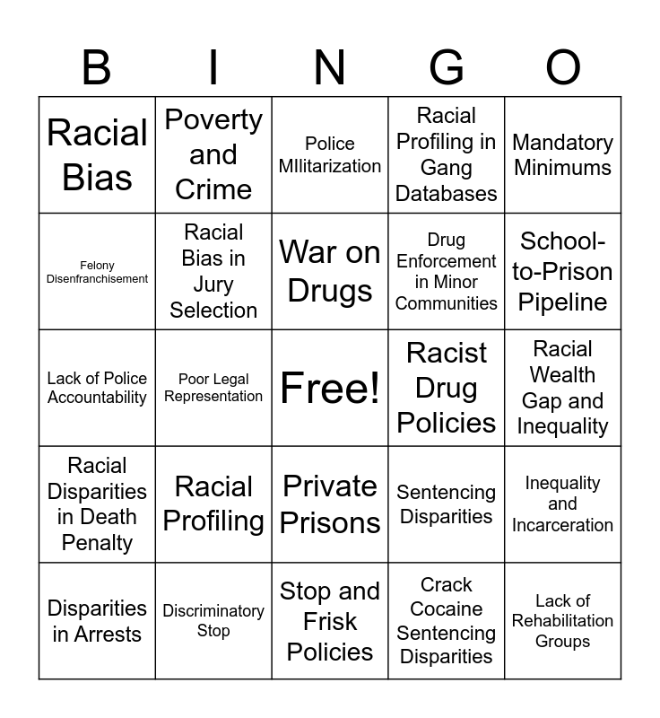 This bingo card has a free space and 24 words: Racial Profiling, Discriminatory Stop, War on Drugs, Disparities in Arrests, Mandatory Minimums, Racial Bias, Felony Disenfranchisement, Poverty and Crime, Racist Drug Policies, Private Prisons, Drug Enforcement in Minor Communities, Lack of Police Accountability, Sentencing Disparities, Inequality and Incarceration, Racial Bias in Jury Selection, Crack Cocaine Sentencing Disparities, Racial Wealth Gap and Inequality, Police MIlitarization, School-to-Prison Pipeline, Poor Legal Representation, Lack of Rehabilitation Groups, Racial Disparities in Death Penalty, Racial Profiling in Gang Databases and Stop and Frisk Policies.