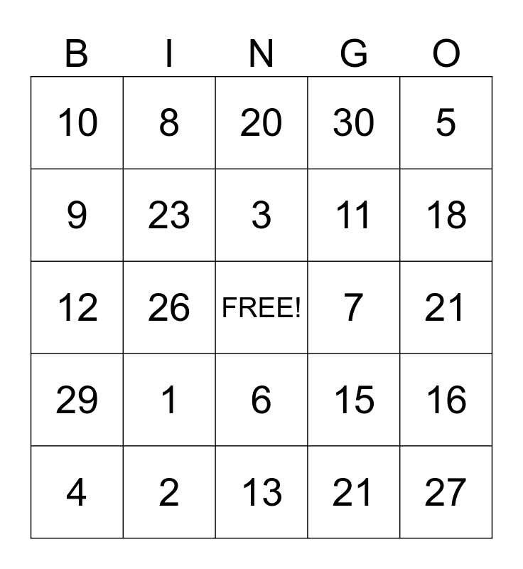 This bingo card has a free space and 24 words: 1, 2, 3, 4, 5, 10, 9, 8, 7, 6, 11, 12, 15, 16, 23, 21, 21, 20, 18, 26, 27, 29, 30 and 13.
