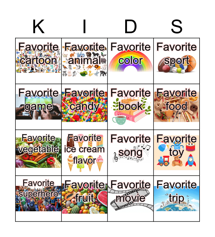 This bingo card has 16 images and 16 words: Favorite fruit, Favorite toy, Favorite color, Favorite cartoon, Favorite vegetable, Favorite animal, Favorite song, Favorite movie, Favorite game, Favorite candy, Favorite superhero, Favorite sport, Favorite ice cream flavor, Favorite food, Favorite book and Favorite trip.