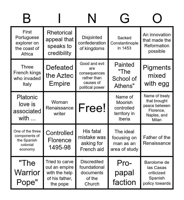 This bingo card has a free space and 24 words: Controlled Florence 1495-98, Tried to carve out an empire with the help of his father, the pope, Good and evil are consequences rather than causes of political power, "The Warrior Pope", An innovation that made the Reformation possible, First Portuguese explorer on the coast of Africa, Three French kings who invaded Italy, Rhetorical appeal that speaks to credibility, Name of Moorish controlled territory in Iberia, His fatal mistake was asking for French aid, Painted "The School of Athens", Platonic love is associated with ..., The ideal focusing on man as an area of study, Father of the Renaissance, Defeated the Aztec Empire, Pro-papal faction, Name of treaty that brought peace between Florence, Naples, and Milan, Disjointed confederation of kingdoms, Pigments mixed with egg, Woman Renaissance writer, Barolome de las Casas criticized Spanish policy towards, One of the three components of the Spanish colonial economy, Sacked Constantinople in 1453 and Discredited foundational documents of the Church.