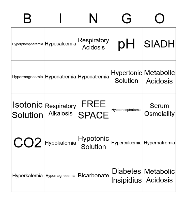 This bingo card has a free space and 24 words: Hypokalemia, Hypomagnesemia, Hyponatremia, Hyperkalemia, SIADH, Hyperphosphatemia, Hypermagnesmia, Hypocalcemia, Hypophosphatemia, Hypotonic Solution, Hypertonic Solution, Isotonic Solution, Hypercalcemia, Hypernatremia, Hyponatremia, Diabetes Insipidius, Serum Osmolality, Respiratory Acidosis, Metabolic Acidosis, Respiratory Alkalosis, Metabolic Acidosis, CO2, pH and Bicarbonate.