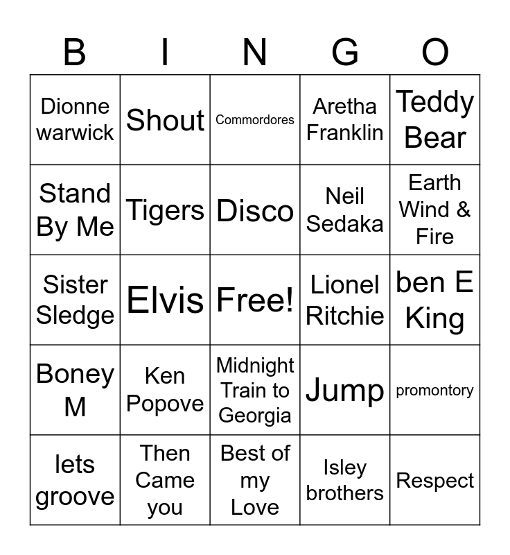 This bingo card has a free space and 38 words: kelowna, maple, Lions, Tigers, promontory, Ken Popove, Disco, Tennessee Ernie Ford, Teddy Bear, Neil Sedaka, Elvis, Aretha Franklin, Respect, ben E King, Stand By Me, Boney M, Sunny, Commordores, Brick House, Lionel Ritchie, Dionne warwick, Then Came you, Earth Wind & Fire, lets groove, Emotions, Best of my Love, Fifth Dimension, Aquarius, George Benson, Turn Your Love around, Gladys Knight, Midnight Train to Georgia, Isley brothers, Shout, Pointer Sisters, Jump, Sister Sledge and We Are family.