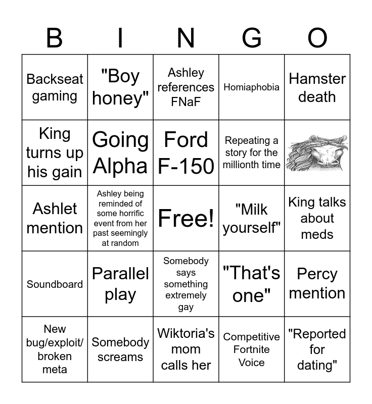 This bingo card has 1 images, a free space and 33 words: Crudge mention, Competitive Fortnite Voice, Wiki mispronounces something horribly, "Mad City is garbage" discussion, Soundboard, Going Alpha, Hamster death, New bug/exploit/ broken meta, "Boy honey", Rewatching any clip from Banditry, Ford F-150, Ashley references FNaF, Somebody else actually joins VC, Autistus name drop, "Milk yourself", Somebody screams, Ashlet mention, Parallel play, "That's one", Somebody says something extremely gay, Hivemind moment, Backseat gaming, King talks about meds, Wiktoria's mom calls her, "Reported for dating", Homiaphobia, 11/22, Repeating a story for the millionth time, King turns up his gain, Gaslighting, Ashley being reminded of some horrific event from her past seemingly at random, Percy mention and ".......what?".