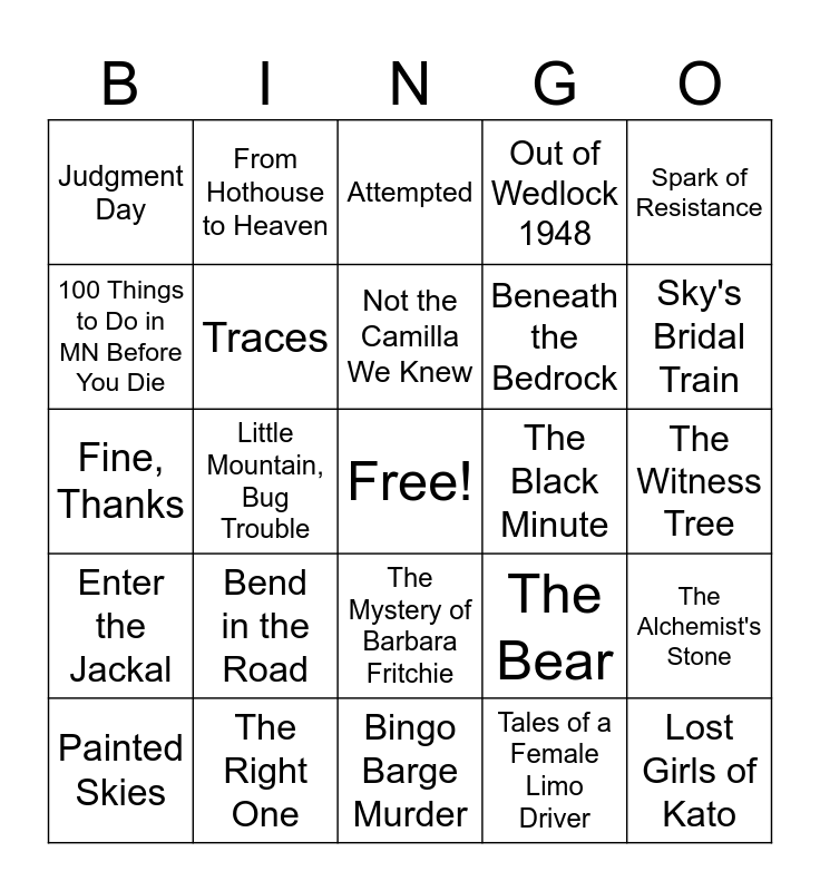 This bingo card has a free space and 24 words: Bend in the Road, The Right One, Not the Camilla We Knew, Painted Skies, Spark of Resistance, Judgment Day, 100 Things to Do in MN Before You Die, From Hothouse to Heaven, The Black Minute, The Mystery of Barbara Fritchie, Beneath the Bedrock, Fine, Thanks, The Bear, The Alchemist's Stone, Traces, Tales of a Female Limo Driver, The Witness Tree, Attempted, Sky's Bridal Train, Little Mountain, Bug Trouble, Lost Girls of Kato, Enter the Jackal, Out of Wedlock 1948 and Bingo Barge Murder.