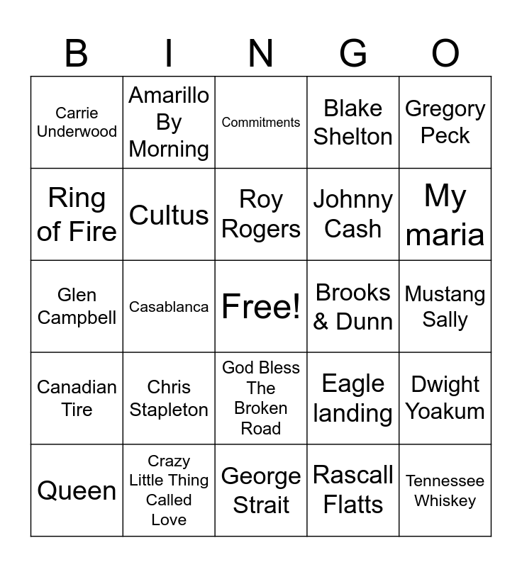 This bingo card has a free space and 36 words: Beaver, Eagle, Ottawa, Cultus, Eagle landing, Canadian Tire, Roy Rogers, Rosa Parks, Gregory Peck, Anthony Perkins, Casablanca, Blake Shelton, Boys Round Here, Brooks & Dunn, My maria, Carrie Underwood, Before He Cheats, Chris Stapleton, Tennessee Whiskey, Commitments, Mustang Sally, Dwight Yoakum, Crazy Little Thing Called Love, Queen, George Strait, Amarillo By Morning, Glen Campbell, Rhinestone Cowboy, Johnny Cash, Ring of Fire, Nitty Gritty Dirt band, Mr Bojangles, Rascall Flatts, God Bless The Broken Road, Shania Twain and Party For Two.