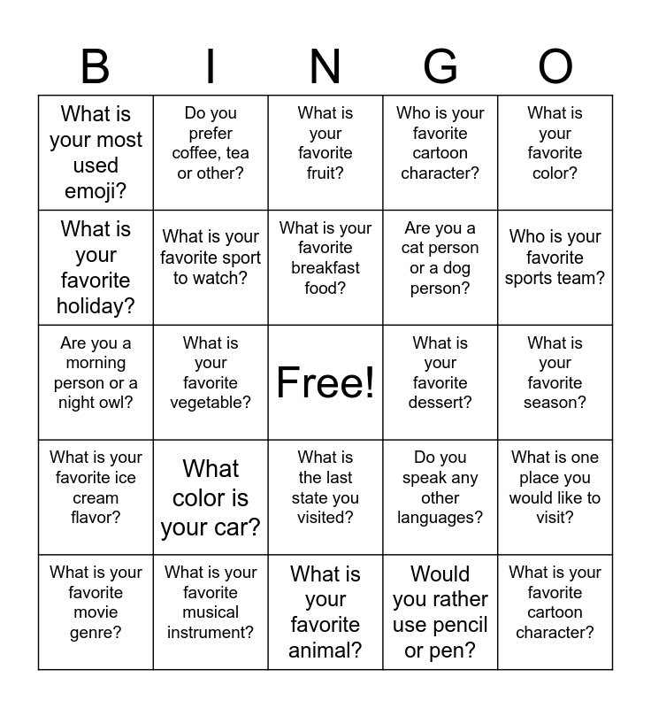 This bingo card has a free space and 25 words: What color is your car?, What is your favorite animal?, What is your favorite breakfast food?, What is your favorite movie genre?, What is your favorite color?, What is your most used emoji?, What is your favorite holiday?, Do you prefer coffee, tea or other?, What is your favorite dessert?, What is the last state you visited?, Are you a cat person or a dog person?, Are you a morning person or a night owl?, Do you speak any other languages?, What is one place you would like to visit?, What is your favorite sport to watch?, What is your favorite sport to play?, What is your favorite season?, What is your favorite fruit?, Who is your favorite sports team?, What is your favorite vegetable?, What is your favorite cartoon character?, What is your favorite musical instrument?, What is your favorite ice cream flavor?, Who is your favorite cartoon character? and Would you rather use pencil or pen?.