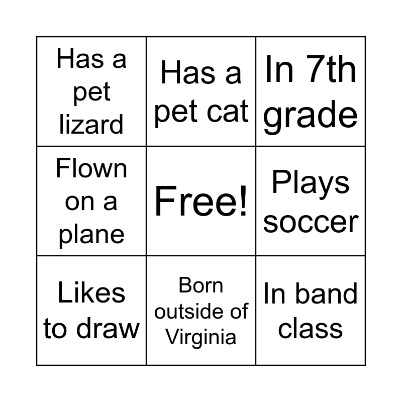 This bingo card has a free space and 20 words: Does not have any siblings, Has 2 pets, In 7th grade, Plays football, Plays videogames, In band class, Has an older sibling, Has a pet lizard, Has a pet dog, Has a pet cat, Has a younger sibling, Plays basketball, Plays soccer, Plays tennis, Likes to draw, Is in chorus, Born outside of Virginia, Flown on a plane, Watches anime and Can ride a bike.