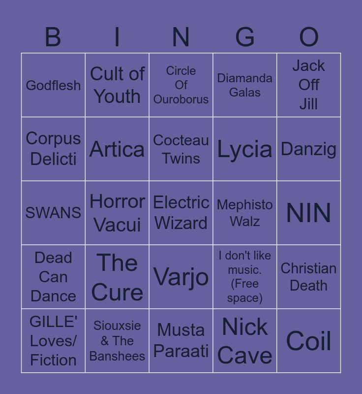 This bingo card has 25 words: The Cure, Musta Paraati, Cocteau Twins, GILLE' Loves/ Fiction, Jack Off Jill, Godflesh, Corpus Delicti, Cult of Youth, Mephisto Walz, Varjo, Lycia, SWANS, I don't like music. (Free space), Christian Death, Artica, Coil, NIN, Circle Of Ouroborus, Danzig, Horror Vacui, Electric Wizard, Siouxsie & The Banshees, Dead Can Dance, Diamanda Galas and Nick Cave.