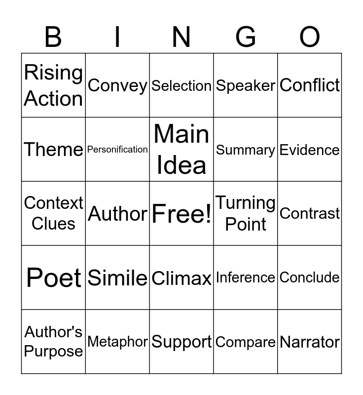 This bingo card has a free space and 24 words: Simile, Metaphor, Main Idea, Author's Purpose, Conflict, Rising Action, Theme, Convey, Turning Point, Climax, Summary, Context Clues, Inference, Conclude, Personification, Compare, Contrast, Selection, Evidence, Author, Narrator, Poet, Speaker and Support.