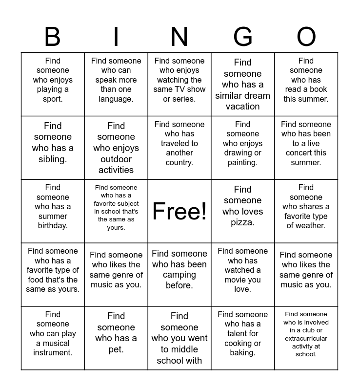 This bingo card has a free space and 24 words: Find someone who likes the same genre of music as you., Find someone who has a pet., Find someone who has traveled to another country., Find someone who can play a musical instrument., Find someone who has read a book this summer., Find someone who enjoys playing a sport., Find someone who has a sibling., Find someone who can speak more than one language., Find someone who loves pizza., Find someone who has been camping before., Find someone who enjoys drawing or painting., Find someone who has a summer birthday., Find someone who has watched a movie you love., Find someone who likes the same genre of music as you., Find someone who enjoys outdoor activities, Find someone who has a talent for cooking or baking., Find someone who shares a favorite type of weather., Find someone who enjoys watching the same TV show or series., Find someone who has been to a live concert this summer., Find someone who has a favorite subject in school that's the same as yours., Find someone who is involved in a club or extracurricular activity at school., Find someone who has a favorite type of food that's the same as yours., Find someone who has a similar dream vacation and Find someone who you went to middle school with.