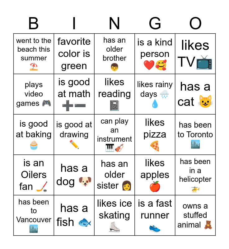 This bingo card has 25 words: has a dog đś, likes ice skating â¸ď¸, likes reading đ, has been to Vancouver đď¸, likes TVđş, went to the beach this summer âąď¸, plays video games đŽ, favorite color is green, likes pizza đ, has an older sister đŠ, likes rainy days đ§ď¸đ§, is good at baking đ§, likes apples đ, has been in a helicopter đ, is good at math ââ, owns a stuffed animal đ§¸, has been to Toronto đď¸, has an older brother đŚ, has a cat đş, is good at drawing âď¸, can play an instrument đšđť, has a fish đ, is an Oilers fan đ, is a kind person â¤ď¸đĽ° and is a fast runner đ.