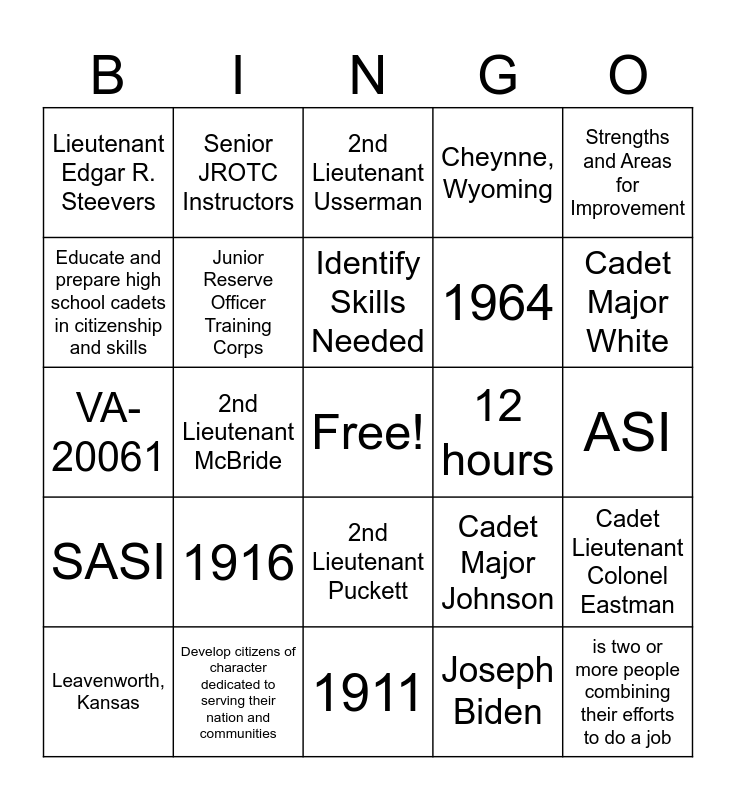 This bingo card has a free space and 24 words: Leavenworth, Kansas, 1916, Identify Skills Needed, Joseph Biden, Strengths and Areas for Improvement, Lieutenant Edgar R. Steevers, Senior JROTC Instructors, 2nd Lieutenant Usserman, 12 hours, ASI, VA-20061, Junior Reserve Officer Training Corps, Cadet Major Johnson, Cadet Lieutenant Colonel Eastman, Educate and prepare high school cadets in citizenship and skills, Develop citizens of character dedicated to serving their nation and communities, 1911, Cheynne, Wyoming, Cadet Major White, SASI, 2nd Lieutenant McBride, 2nd Lieutenant Puckett, 1964 and is two or more people combining their efforts to do a job.