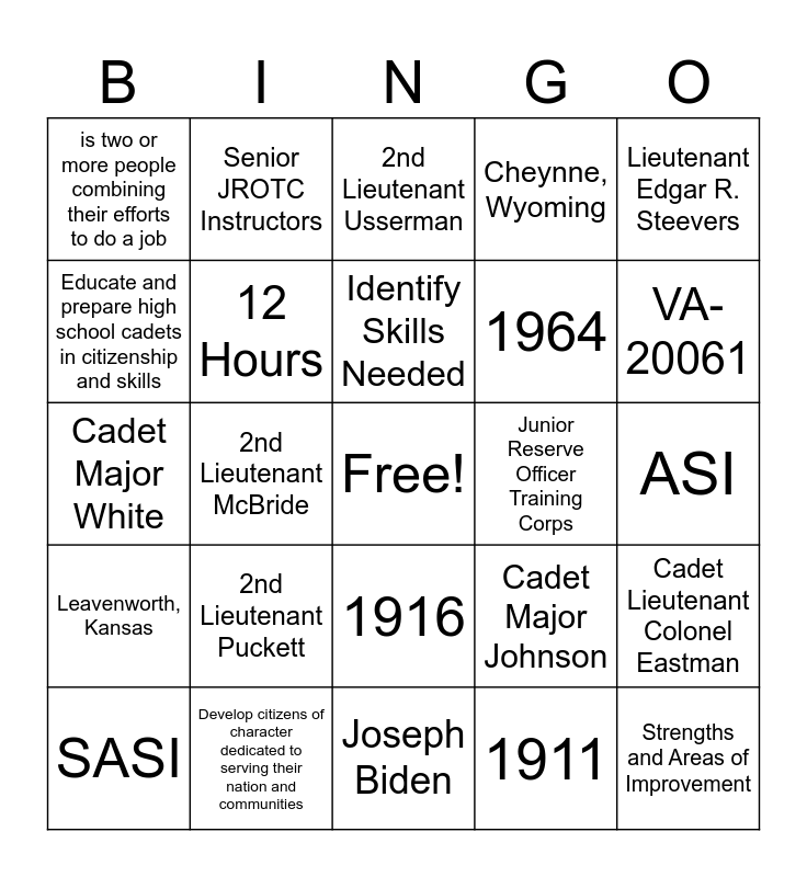This bingo card has a free space and 24 words: SASI, 2nd Lieutenant Puckett, Identify Skills Needed, 1911, Lieutenant Edgar R. Steevers, is two or more people combining their efforts to do a job, Senior JROTC Instructors, 2nd Lieutenant Usserman, Junior Reserve Officer Training Corps, ASI, Cadet Major White, 12 Hours, Cadet Major Johnson, Cadet Lieutenant Colonel Eastman, Educate and prepare high school cadets in citizenship and skills, Develop citizens of character dedicated to serving their nation and communities, Joseph Biden, Cheynne, Wyoming, VA-20061, Leavenworth, Kansas, 2nd Lieutenant McBride, 1916, 1964 and Strengths and Areas of Improvement.