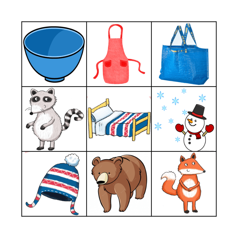 This bingo card has 8 images and a free space.